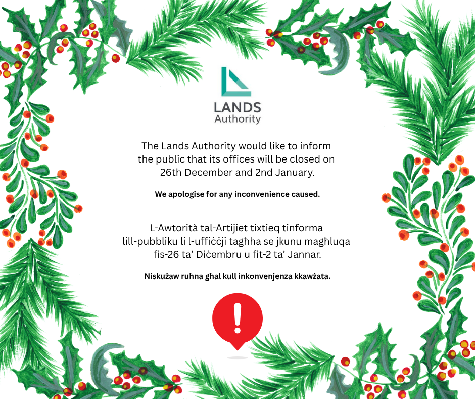 The Lands Authority would like to inform the public that the Customer Care and Cash Office will be closed on the morning of Tuesday, 10th June. We apologize for any inconvenience this may cause.